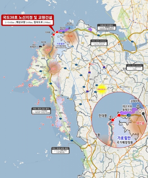 이번에 이원~대산간 연륙교가 신규 국도노선으로 지정됨으로써 전액 국비 지원으로 해상교량 건설의 법적 근거가 마련된 셈이다.