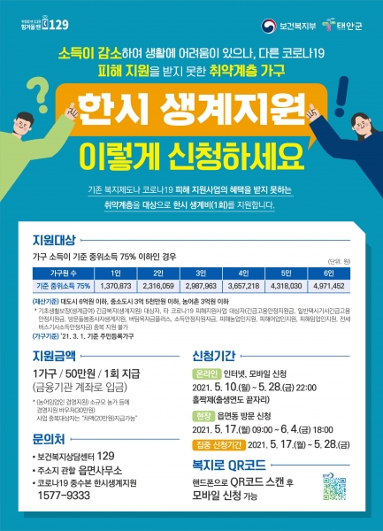 지원 대상은 올해 3월 1일 기준 태안에 주민등록이 돼 있는 2019~2020년 대비 올해 소득이 감소한 가구로 가구소득이 기준중위소득 75% 이하이고 재산기준이 3억원 이하인 가구이다.