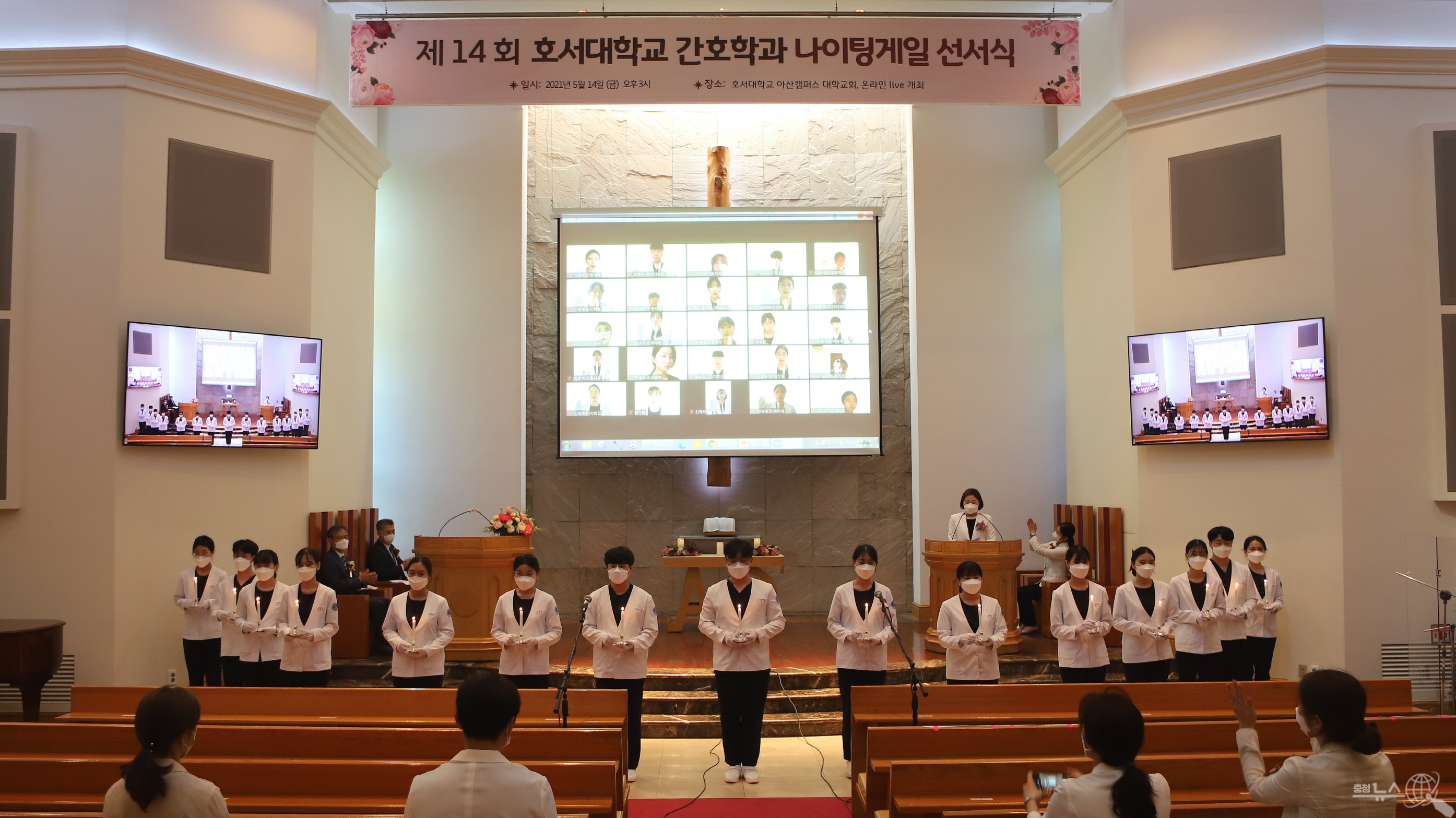 선서식에서는 임상실습에 첫 발을 내딛는 간호학과 3학년 학생 중 방역수칙에 준하여 일부 학생이 대학교회에서 대면으로 참석하고, 대부분의 학생은 비대면 화상으로 참석해 의로운 태도로 최선을 다해 간호전문직에 임할 것을 서약했다.