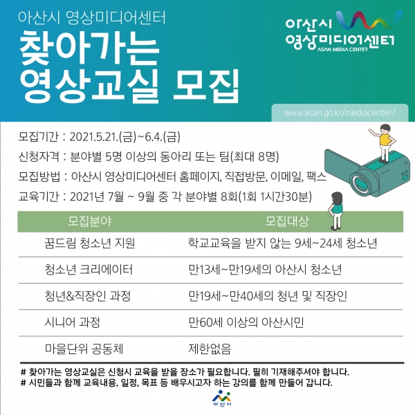 5명 이상의 동아리 또는 팀을 구성하고 아산시 홈페이지, 이메일직접 방문, 팩스를 통해 영상미디어센터 찾아가는 영상교실 수업을 신청하면 분야별 1팀을 선정해 교육을 진행할 예정이다.