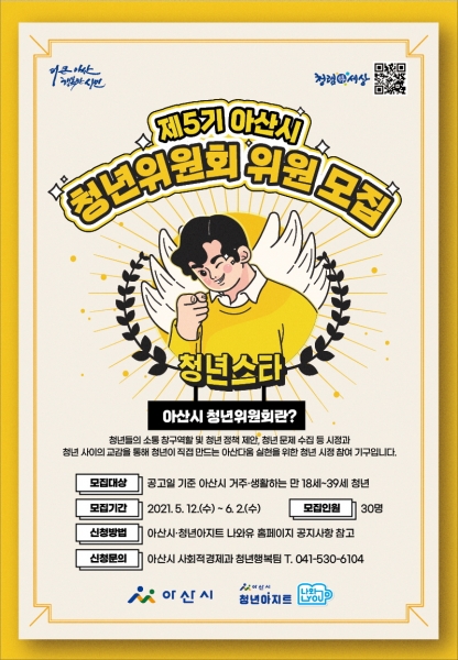 [충청뉴스큐] 아산시가 청년 정책 수립 및 청년들과의 소통 창구 확대를 통한 청년 시정 참여 활성화를 위해 ‘제5기 아산시 청년위원회’ 청년 위원을 공개 모집한다.