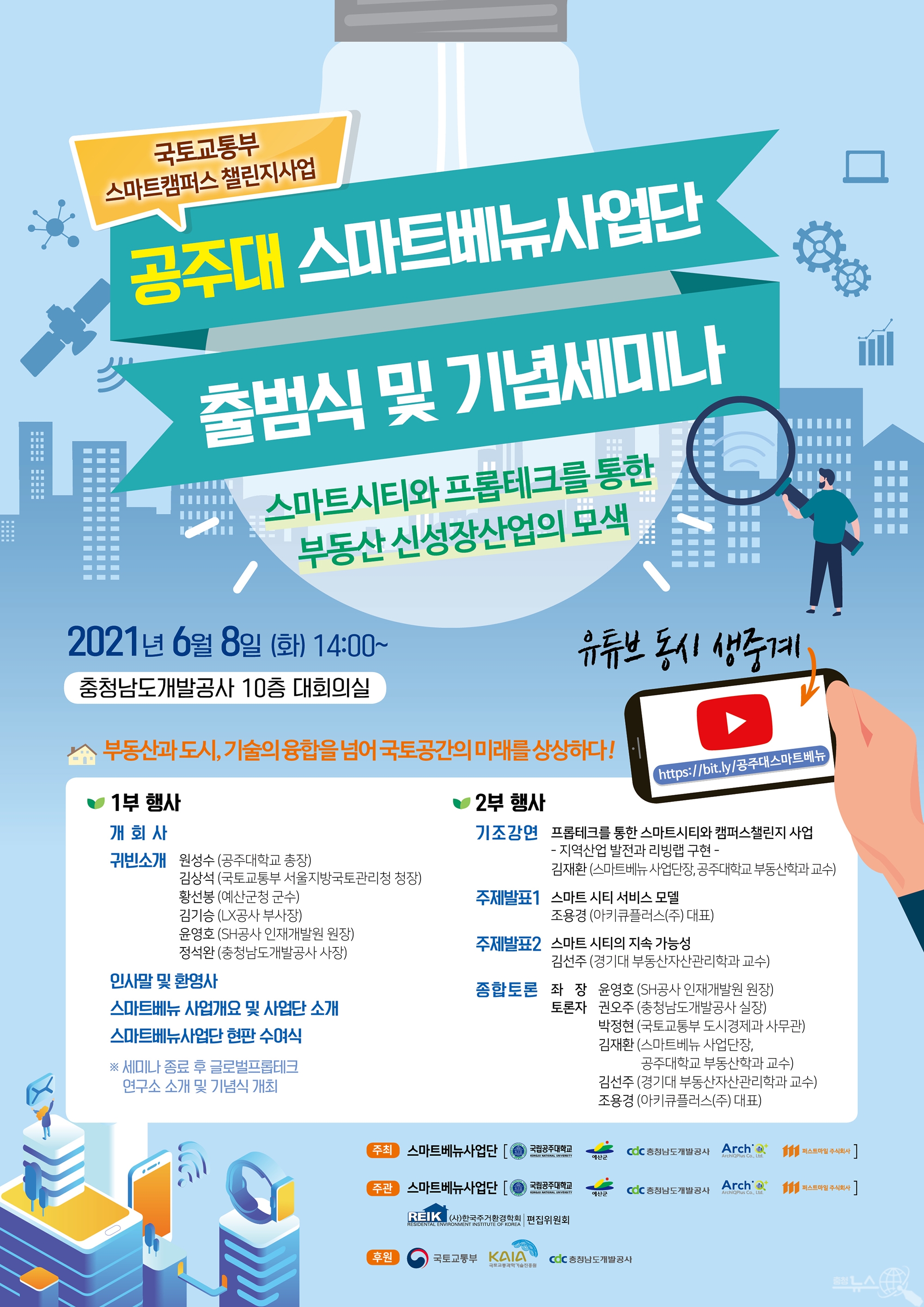 출범식에 이어 기념세미나로 김재환 공주대 부동산학과 교수가 ‘프롭테크를 통한 스마트시티와 캠퍼스챌린지사업’에 대해 기조강연을 실시하고, 조용경 아키큐플러스(주) 대표(공주대 겸임교수)와 김선주 경기대 부동산자산관리학과 교수가 각각 주제발표를 실시한다.