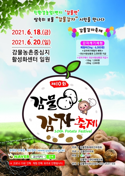 축제기간 중 괴산군 온라인 쇼핑몰인 ‘괴산장터’에서도 감물감자를 구매할 수 있다,감물감자축제는 오는 6월 18일부터 6월 20일까지 3일간 감물면농촌중심지활성화센터에서 개최된다.