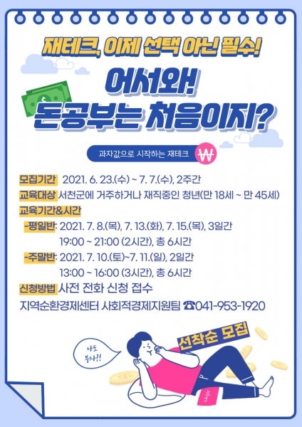 2030세대의 최대 관심사인 재테크 교육 과정인 ‘어서와 돈 공부는 처음이지?’는 서천군에 거주 또는 재직 중인 청년을 대상으로 평일반, 주말반 각 15명의 교육생을 모집한다.