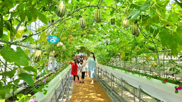 농업기술센터 內 길이 30미터, 폭 14미터로 조성된 박터널은 조롱박, 미니홍라인, 줄무늬국수호박, 사두오이 등 알록달록 관상용 박 12종이 풍성하게 터널을 이루고 있어 코로나19와 무더위로 지친 시민들에게 작은 휴식처가 될 것으로 기대된다.