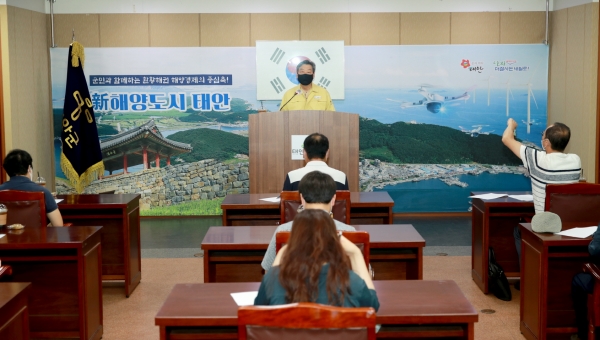 가세로 태안군수는 26일 오전 10시 군청 소회의실에서 긴급 브리핑을 갖고 태안군을 비롯한 보령시와 서천군 등 3개 지자체는 지역 자영업자와 소상공인의 고통 최소화를 위해 사회적 거리두기 단계를 현행 유지한다고 밝혔다.