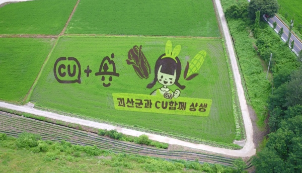 문광저수지 일원 5481㎡ 면적의 논에 ‘CU와 괴산농가와 함께 상생’이라는 주제로 CU편의점 캐릭터 ‘하루’가 그려졌다.