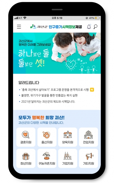 모바일 앱 서비스는 구글 플레이 스토어에서 “괴산 인구증가시책”을 검색하면 쉽게 다운로드가 가능하고 앱을 통해 결혼, 출산, 전입, 귀농귀촌 등의 시책을 한눈에 확인할 수 있다.