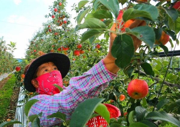 군에 따르면, 태안읍 인평리에 위치한 한 사과농장에서는 약 6ha의 면적에서 국내 육성품종인 ‘아리수’를 비롯해 ‘홍로’, ‘자홍’을 재배하고 있으며 폭염과 폭우에도 불구하고 작황이 좋아 최근 수확이 한창이다.