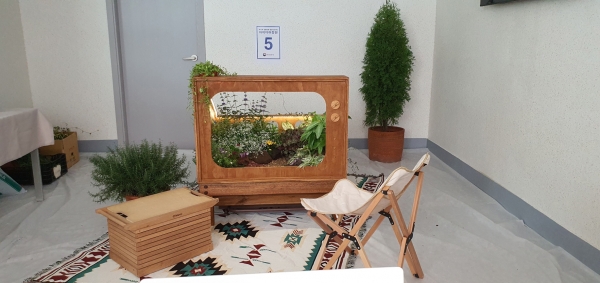 ‘꽃멍, 풀멍’ 작품은 편안한 휴식과 자연과의 소통을 중점으로 둔 디자인으로 ‘본다’라는 의미를 담기 위해 TV형태의 목재화분을 제작해 식물을 심었다.