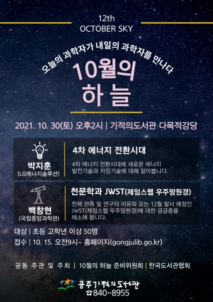 [충청뉴스큐] 공주시가 10월의 하늘 준비위원회와 한국도서관협회가 주최하는 ‘10월의 하늘’ 과학강연을 오는 30일 기적의도서관에서 진행한다.