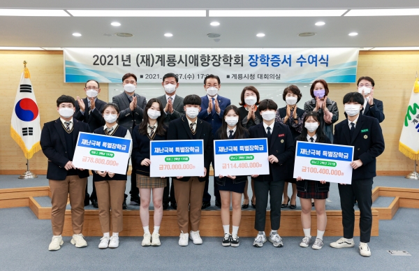 [충청뉴스큐] 계룡시애향장학회는 지난 27일 시청 대회의실에서 관내 고등학교 학교장 및 각 학교 대표 장학생 8명을 포함한 20여명이 참석한 가운데 2021학년도 ‘재난극복 특별장학금’ 장학증서 수여식을 열었다고 전했다.