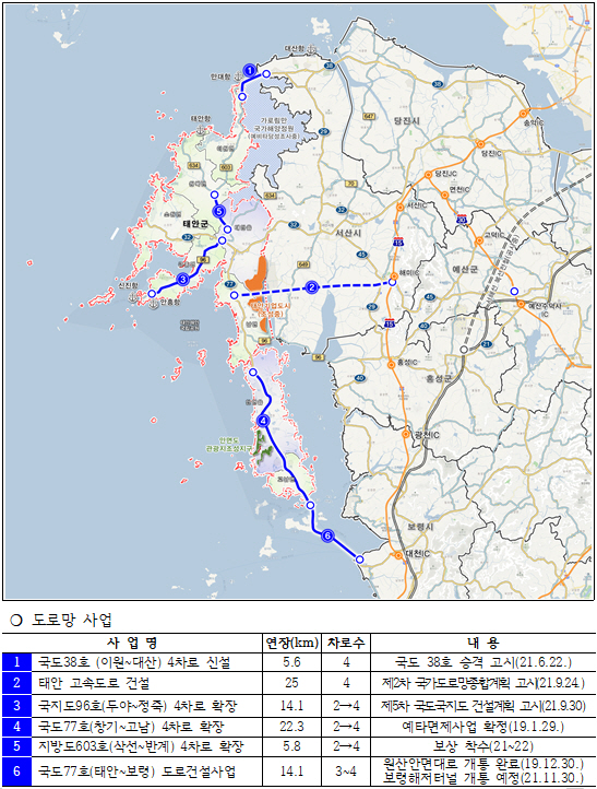 아울러 태안-원북 간 지방도603호선 확포장 사업은 태안화력을 드나드는 대형 화물차량으로 인한 위험성을 줄이고자 충남도에서 465억원을 들여 추진 중이며 현재 행정절차를 마무리하고 충남개발공사와 업무협약을 맺어 보상에 착수한 상태다.