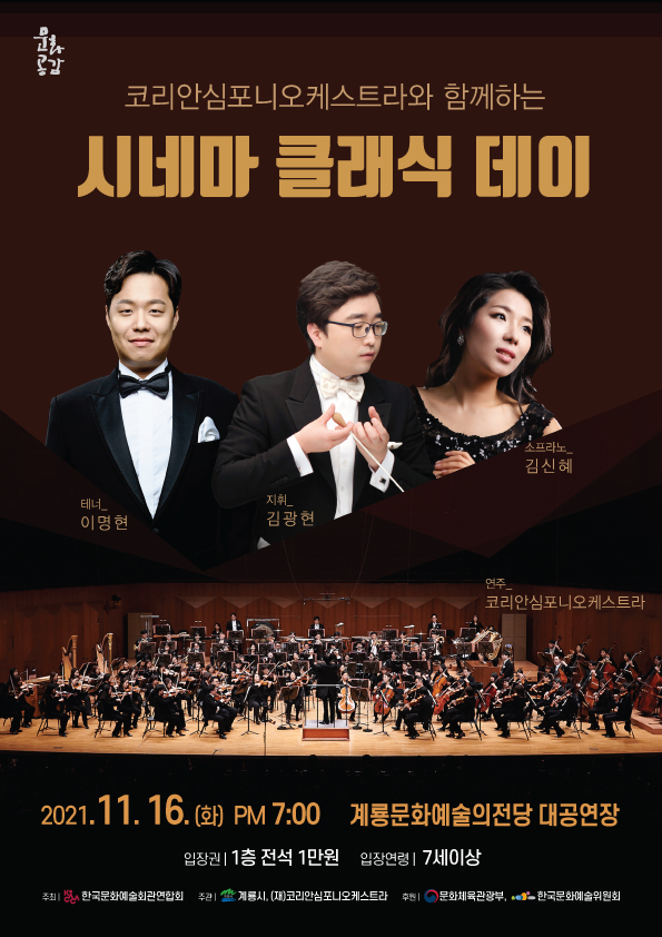 [충청뉴스큐] 계룡시는 오는 16일 오후 7시 계룡문화예술의전당 대공연장에서 코리안 심포니 오케스트라와 함께 하는 ‘시네마 클래식 데이’ 공연을 실시한다고 전했다.