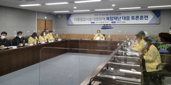 시는 어르신이 많이 거주하고 있는 요양시설 화재상황을 가정해 초기 대응부터 구호 조치에 이르기까지 시청 각 부서 및 유관 기관과 토론 및 필요사항에 대한 협의 등을 통해 효율적인 재난 대응체계 수립 및 해결방안을 도출하는 방식으로 훈련을 진행했다.