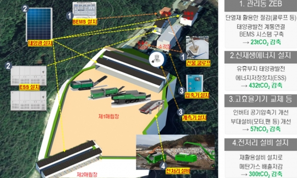 세부적으로는 노후건축물 탄소 배출 제로화를 위한 창호 개선, 외단열, 쿨루프, 외부차양 설치, 고효율기기 교체 등 그린리모델링을 추진하며 폐기물종합처리장 유휴부지 내에 태양광발전 등 신재생에너지 설비를 구축한다.