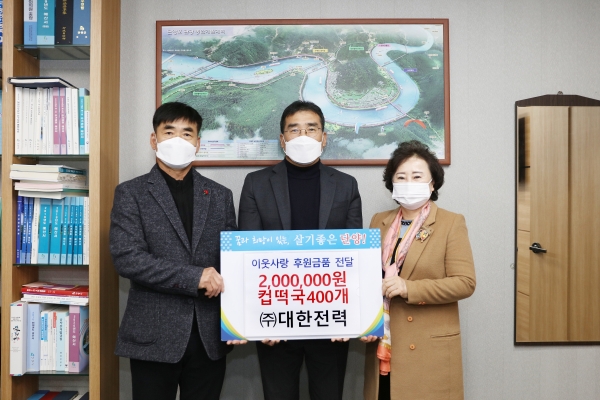 같은 날 ㈜대한전력에서도 즉석조리식품 컵떡국 400개와 후원금 200만원을 군에 전달했다.