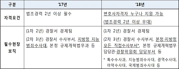변호사들이 더욱 폭넓은 분야에서 역량을 발휘할 수 있도록 올해부터 본청·지방청의 대형사건을 수사하는 모든 부서로 2차 필수현장보직을 확대했다.