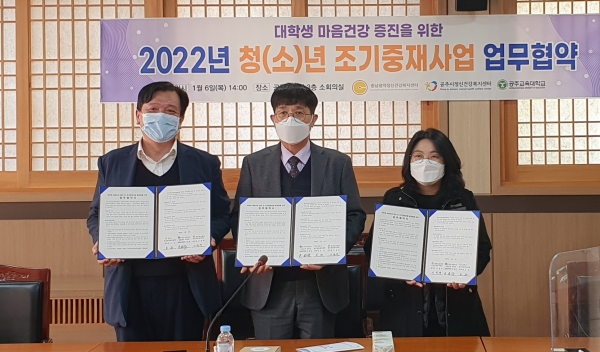 [충청뉴스큐] 공주시는 지난 6일 공주교육대학교 소회의실에서 ‘청년 정신건강 조기중재관리 체계 구축 및 통합지원을 위한 업무협약’을 체결했다.