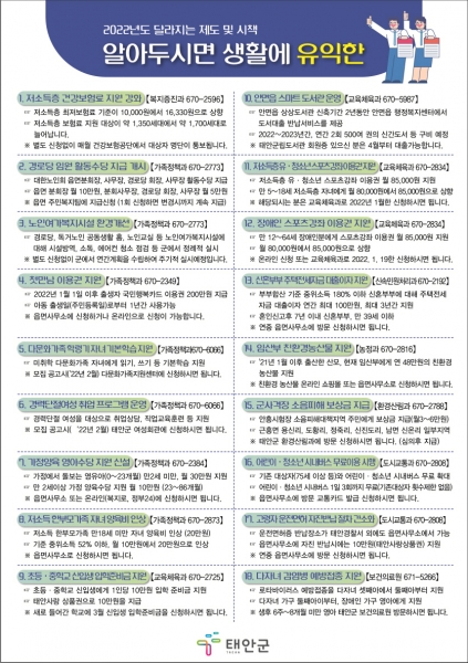 군 관계자는 “올해 가족 중심의 복지혜택을 늘리고 사회적 취약계층에 대한 지원을 강화하는 등 체감 가능한 시책 추진에 최선을 다하고 있다”며 “군민 모두가 행복한 태안군 건설을 위해 앞으로도 전 공직자가 군민의 입장에서 한 번 더 생각하는 행정 추진에 나서겠다”고 말했다.