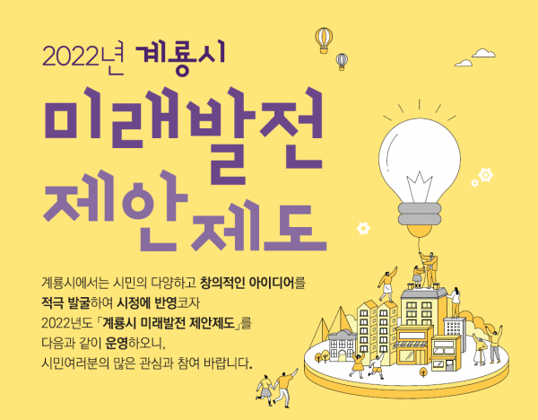 시 관계자는 “제안제도 운영을 통해 시민의 다양하고 참신한 아이디어를 시정에 적극 반영할 예정”이라며 “계룡시 미래발전을 위한 제안제도에 시민 여러분의 많은 관심과 참여를 당부드린다”고 말했다.