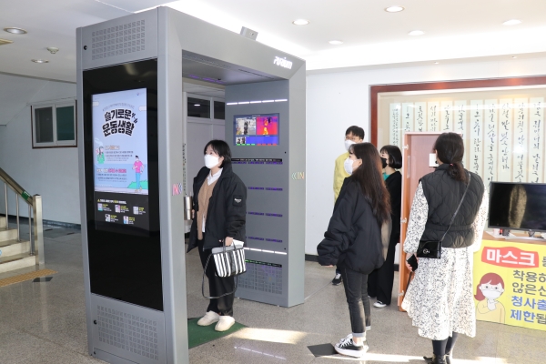10일 군은 민원인 방문이 많은 군청 현관과 옥천읍행정복지센터에 살균과 발열감지가 가능한 방역 소독게이트를 설치해 방역 효율을 높였다.