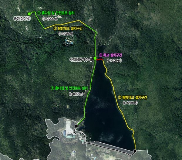 시에 따르면 탐방로는 계룡산 신도안면 용동저수지 둘레길로부터 암용추를 거쳐 삼신당에 이르는 총 3.2km 구간에 폭 1.5m로 조성되며 시는 사업의 첫 단계로 지난 2월 3일 탐방로 조성을 위한 실시설계용역에 착수했고 실시설계를 위한 현장조사 및 측량을 2월 중 추진할 예정인 것으로 알려졌다.