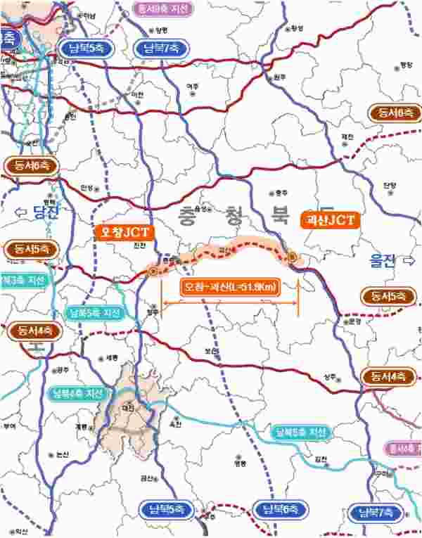 끝으로 오창~괴산간 고속도로 구간은 국가간선도로망 중 국토중심부를 횡단하는 동서 5축에 포함되는 구간으로 공항 및 산업단지 등 주요기반 시설과 연계, 중부내륙권의 신성장산업, 관광사업 활성화 등 경제성장 기반 구축을 위한 도로이다.