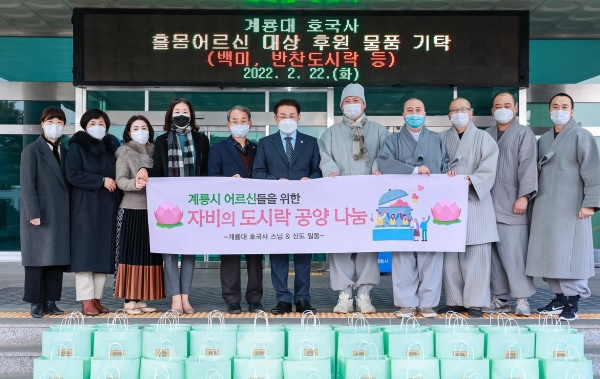 [충청뉴스큐] 계룡시는 지난 22일 계룡대 호국사에서 관내 홀로 거주하는 어르신을 위해 쌀과 반찬 5종으로 이루어진 도시락 129세트를 지원해 왔다고 밝혔다.