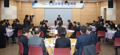 전남도교육청은 15일 보성군청소년수련원에서 14개 직속기관장과 22개 교육지원청 교육장 및 본청 실·과장 등 61명이 참석한 가운데 새해 첫 전남교육정책월례회를 개최했다.