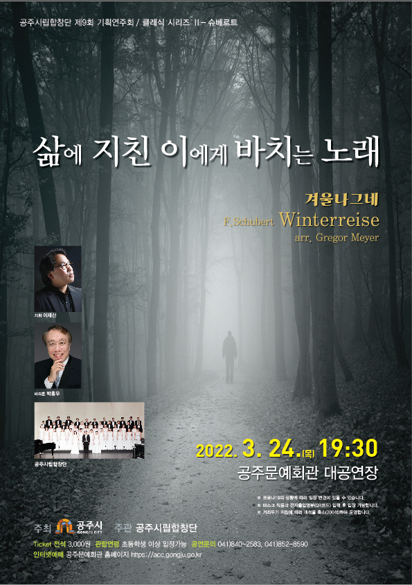 공주시립합창단이 지난해 바흐의 ‘칸타타’ 공연을 통해 선보인 클래식시리즈에 이어 두 번째로 선보이는 기회연주회로 독창으로만 연주되던 ‘겨울나그네’와 달리 전곡을 솔로와 합창이 함께하는 색다른 연주를 감상할 수 있다.