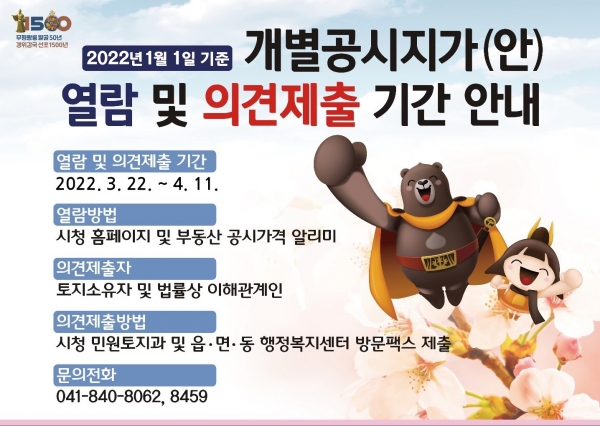 [충청뉴스큐] 공주시는 2022년 1월 1일 기준 개별공시지가을 오는 22일부터 열람·공개하고 4월 11일까지 토지소유자와 이해관계인의 의견을 접수한다.