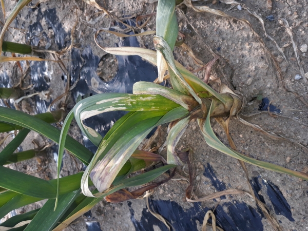 마늘 잎집썩음병은 3~4월 10℃ 전·후 다습한 환경에서 발생하기 시작해 수확기까지 계속 발병하는데 마늘의 잎집이 담갈색으로 변하며 썩어들어가고 피해가 심하면 감염 부위가 물러지면서 주저앉는 증상을 보인다.