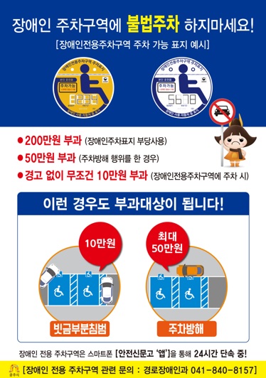 또한, 장애인전용주차구역에 물건을 쌓거나 2면 이상을 이중 주차해 통행로를 가로막는 주차방해 행위 시에는 50만원, 주차 표지를 위조해 부당하게 사용하는 경우 과태료 200만원이 부과된다.