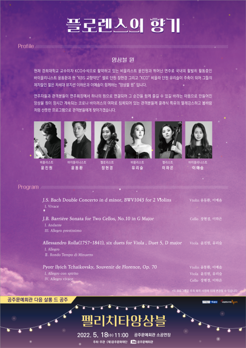 공연 프로그램은 피렌체에서 받은 예술적 영감을 아름답게 표현한 차이콥스키의 ‘플로렌스의 추억’, 당대 최고의 첼로 주자 장 바티스트 바리에르의 ‘2대의 첼로를 위한 소나타 G장조’, 음악의 아버지 바흐의 협주곡 중 가장 아름다운 곡의 하나로 꼽히는 ‘두 대의 바이올린을 위한 협주곡’ 등 산뜻한 클래식 선율이 가득한 무대가 펼쳐질 예정이다.