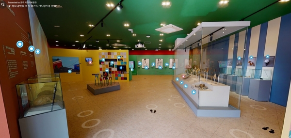 360도 VR영상을 통해 실제 전시관에 와 있는 것처럼 전시실 전경, 유물, 설명, 영상 등 다양한 자료를 관람할 수 있다.