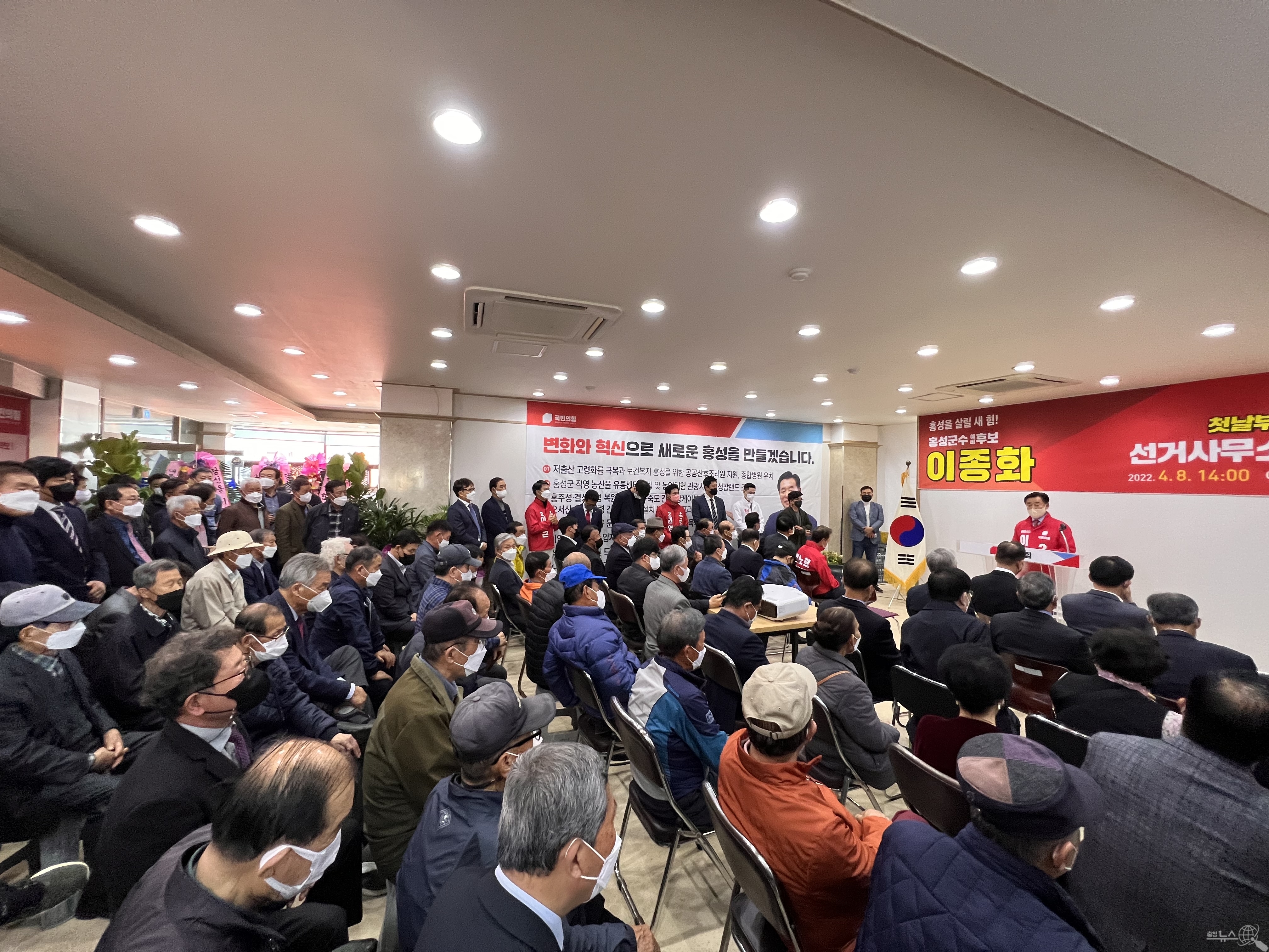국민의힘 이종화 홍성군수 예비후보가 8일 홍성읍 대승빌딩에 마련한 선거사무실에서 개소식을 열고 오는 6월 1일 전국 지방선거에 홍성발전에 대한 비전을 제시했다.