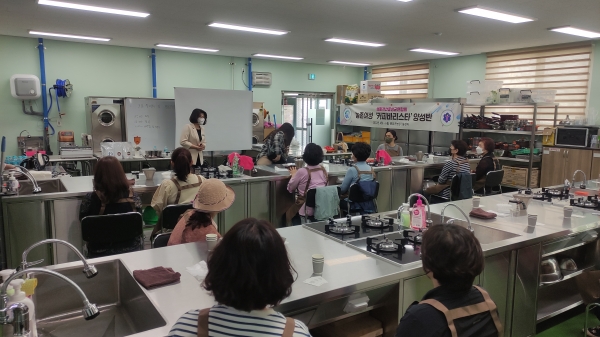 이번 교육은 1회에 18명씩 2차례에 걸쳐 진행했으며 바리스타 2급 자격증 취득을 목표로 커피 기본상식을 배우고 맛보기 카드를 작성하며 자신의 취향에 맞는 커피를 찾는 시간으로 구성됐다.