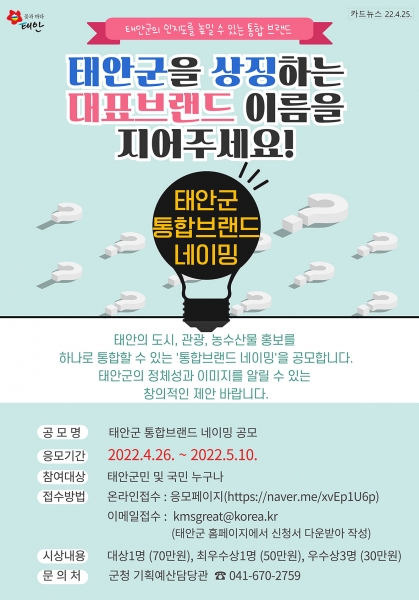 군은 태안의 정체성과 도시 이미지를 대표할 수 있는 통합 브랜드를 개발키로 하고 4월 26일부터 5월 10일까지 통합 브랜드 네이밍 공모를 실시한다고 밝혔다.