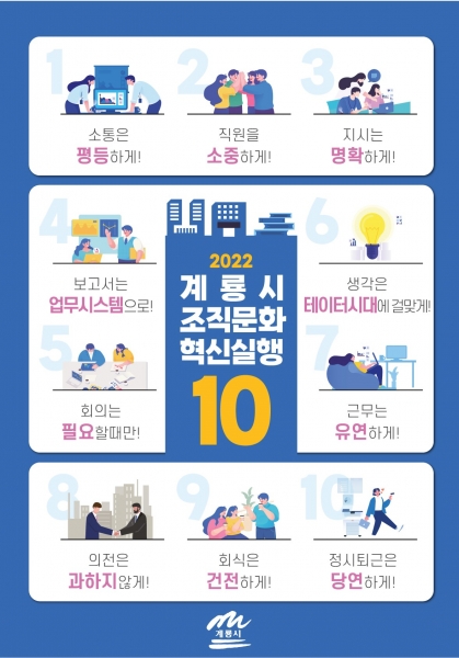 이를 위해 ‘2022년 계룡시 조직문화 혁신 계획’을 수립, ‘활기차고 신뢰받는 공직문화 정착’이라는 목표 아래 수직적 사고방식 개선 소통과 공감 문화 확산 화합 및 협업문화 정착 휴가사용 적극 권장 건강한 회식문화 만들기 가정친화 문화 조성 불필요 업무 줄이기 효율적 보고 방식 개선 등 11개의 중점과제를 선정·추진에 나섰다.