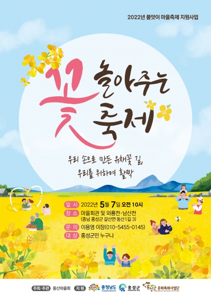 [충청뉴스큐] 홍성군 문화특화사업단에서는 가정의달을 맞이해 오는 5월 7일 갈산면 ‘놀아주는 꽃 축제’와 5월 8일 장곡면 ‘신동리 민속놀이 한마당 축제’그리고 5월 14일 구항면 ‘제1회 대나무 체험축제’를 펼친다.
