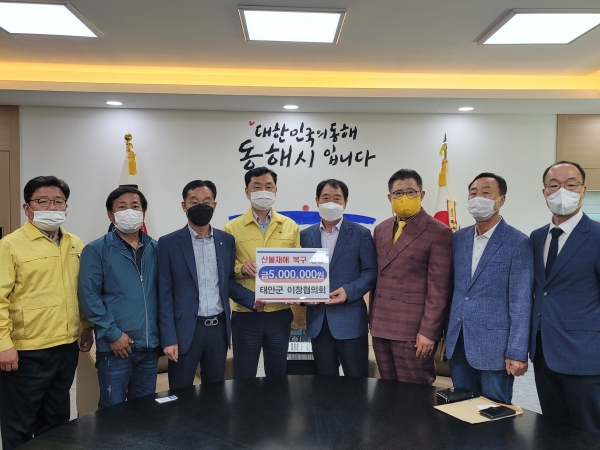 군에 따르면, 김기일 연합회장과 명한식 전 연합회장, 박종환 충남도지부장, 이조형 충남도 사무처장은 지난 6일 동해시청을 방문해 산불피해의 조속한 복구와 이재민 지원에 써달라며 태안군 이장들이 모은 성금을 전했다.