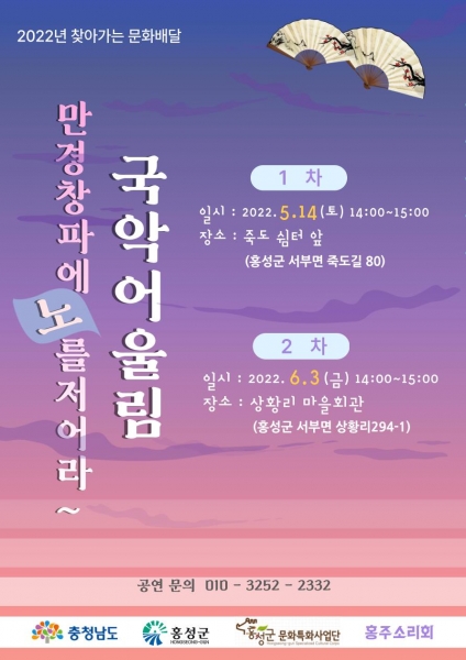 홍주소리회는 ‘만경창파에 노를 저어라~’공연으로 5월 14일 오후 2시에 서부면 죽도 쉼터로 찾아가며 6월 3일은 서부면 상황리 마을회관에서 오후 2시에 개최된다.