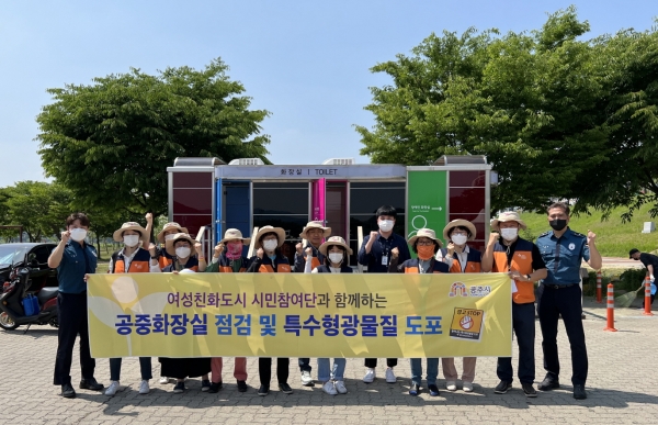 [충청뉴스큐] 공주시는 지난 12일 여성친화도시 시민참여단과 함께 관내 공중화장실 불법 촬영기기 설치 여부 점검 및 특수형광물질 도포를 실시했다.