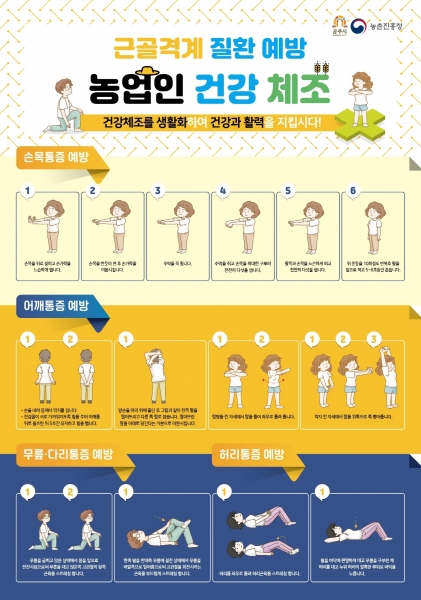 이를 위해 시는 농업인의 근골격계 질환 예방 활동을 위해 16개 읍면동에 근골격계질환 예방 홍보물과 포스터를 게시하고 영농현장을 찾아 교육 및 지도를 할 방침이다.