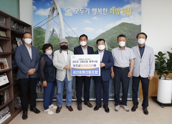 이날 전달식은 민영완 괴산군수 권한대행, 정연서 괴산증평산림조합장 등 관계자 10여명이 참석한 가운데 괴산증평산림조합에 민간협력사업을 위한 사업비 5천만원을 전달했다.