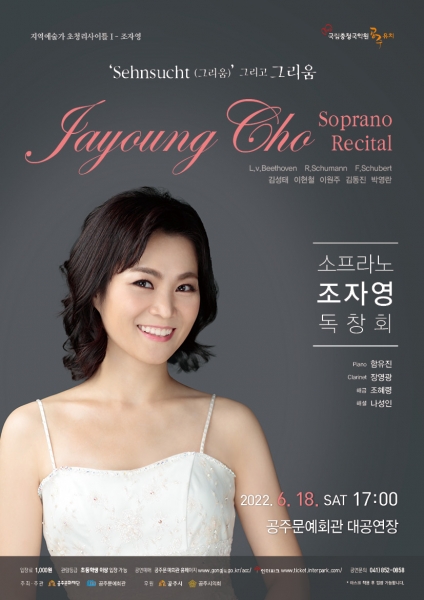 [충청뉴스큐] 지역공연문화 활성화를 위해 지역의 역량 있는 예술가를 초청해 진행되는 2022년 지역예술가 초청 리사이틀 두 번째 공연으로 오는 6월 18일 오후 5시 공주문예회관 대공연장에서 조자영의 ‘Sehnsucht 그리고 그리움’을 선보인다.