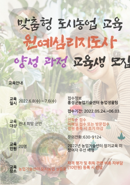 [충청뉴스큐] 홍성군농업기술센터은 2022년 맞춤형 도시농업 교육으로 ‘원예심리지도사 양성 과정’ 참여자를 오는 6월 3일까지 모집한다고 밝혔다.