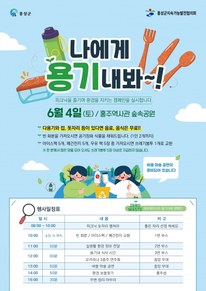 이번 행사는 홍성군청 여하정 일원에서 가족과 함께 피크닉을 즐기며 제로 웨이스트 ‘용기내 캠페인’ 환경의 날 기념 ‘그림그리기 대회’가 진행되고 환경보호를 위해 행사장 내 1회용품은 사용이 금지된다.