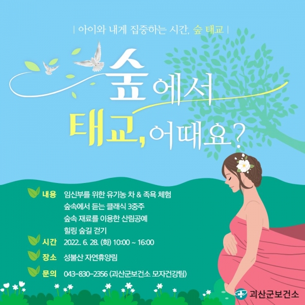 군은 다음달 28일 성불산 자연휴양림에서 괴산군에 거주하는 임신부 및 관내 직장인 임신부를 대상으로 ‘숲 태교 교실’을 운영할 계획이라고 전했다.